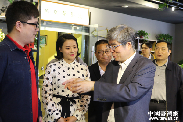 中國(guó)臺(tái)灣網(wǎng)5月8日宿遷訊 (記者 張亞靜)中共中央臺(tái)辦、國(guó)務(wù)院臺(tái)辦主任助理周寧5月7日在宿遷調(diào)研對(duì)臺(tái)工作,走訪臺(tái)灣可成科技有限公司,考察京東﹒臺(tái)企名品館線下體驗(yàn)店,參觀宿遷臺(tái)灣青年就業(yè)創(chuàng)業(yè)基地,并到宿遷學(xué)院看望正在參加電子商務(wù)培訓(xùn)班的臺(tái)灣青年,了解宿遷臺(tái)資企業(yè)情況和臺(tái)灣青年的工作與生活。