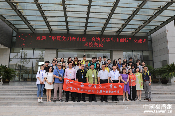 臺(tái)灣大學(xué)生山西行參訪交流團(tuán)在山西傳媒學(xué)院樓前合影。(中國(guó)臺(tái)灣網(wǎng) 袁楚 攝)