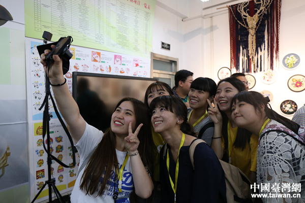 臺(tái)灣大學(xué)生參訪過程中不忘玩自拍。(中國(guó)臺(tái)灣網(wǎng) 袁楚 攝)