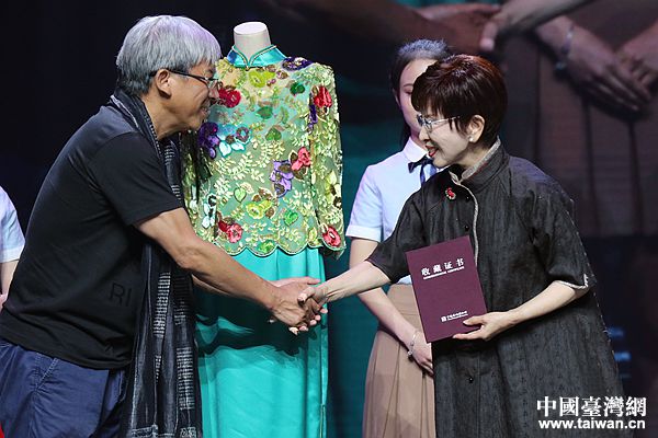 洪秀柱從中國絲綢博物館館長趙豐處接過收藏證書。(中國臺灣網(wǎng) 李奕均 攝)