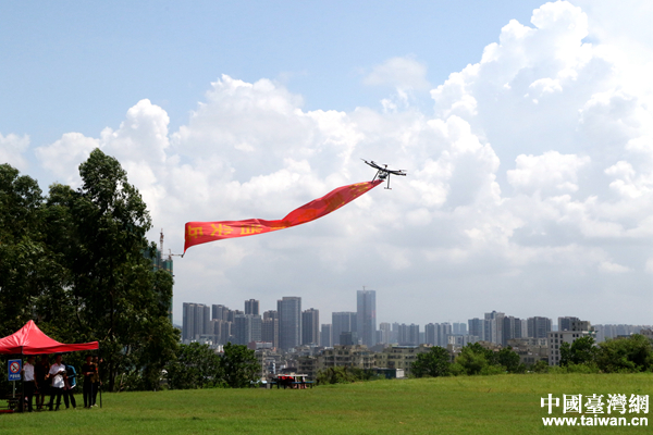 無(wú)人機(jī)表演吊掛條幅。(中國(guó)臺(tái)灣網(wǎng) 尹賽楠 攝)