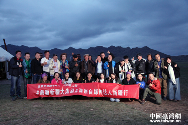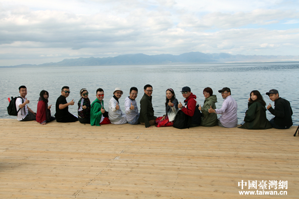 “你好新疆——塞外江南大轟趴”采風(fēng)團(tuán)在賽里木湖邊合影。(中國(guó)臺(tái)灣網(wǎng) 王怡然 攝)