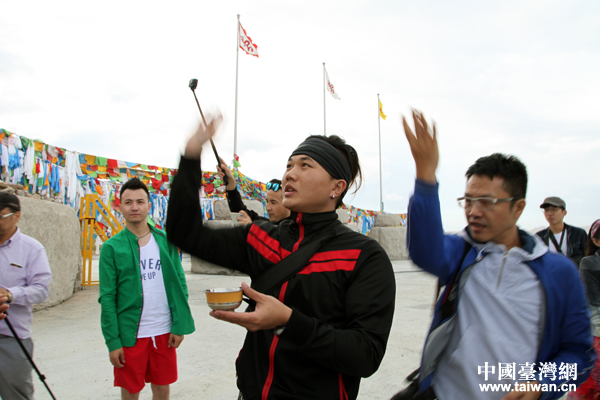 “你好新疆——塞外江南大轟趴”采風(fēng)團(tuán)的90后臺(tái)灣自媒體人對(duì)蒙古族的禮儀不太了解, “老司機(jī)”、臺(tái)灣美食生活旅游類外景攝影達(dá)人溫士凱貼心給他們指導(dǎo)。(中國(guó)臺(tái)灣網(wǎng) 王怡然 攝)