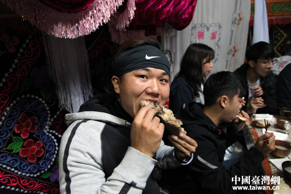 采風(fēng)團(tuán)里的幾位90后臺(tái)灣同胞都是第一次來(lái)新疆,對(duì)蒙古族的禮儀不太了解,每當(dāng)這時(shí),經(jīng)常在大陸各地游走的“老司機(jī)”、臺(tái)灣美食生活旅游類外景攝影達(dá)人溫士凱都會(huì)貼心地走過(guò)來(lái)指導(dǎo):“用無(wú)名指沾下酒朝天彈一下,意思是敬天;再沾下酒朝地彈一下,意思是敬地;最后再沾下酒從左到右抹一下額頭,這是敬父母,然后把酒喝掉!