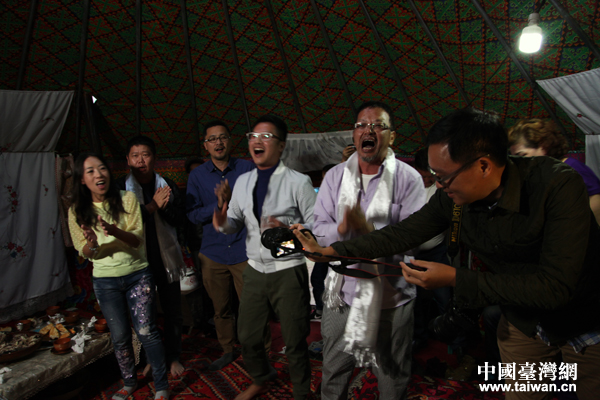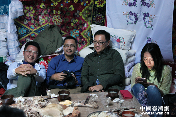 賽里木湖附近青得里浩特呼爾村的村民在氈房款待“你好新疆——塞外江南大轟趴”采風(fēng)團(tuán)一行。(中國(guó)臺(tái)灣網(wǎng) 袁楚 攝)