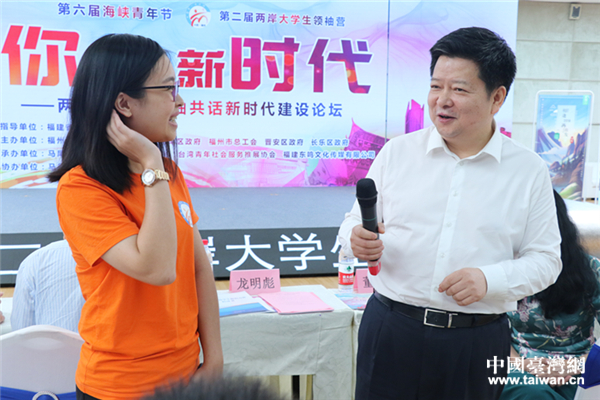 國務(wù)院臺灣事務(wù)辦公室副主任龍明彪與臺灣屏東科技大學(xué)社工系鄭惠心親切交談。(中國臺灣網(wǎng) 郜利敏 攝)
