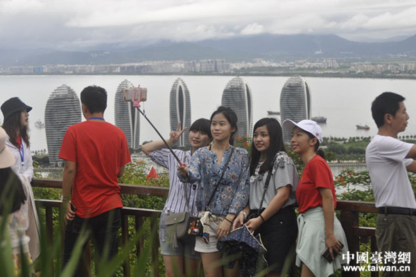 臺(tái)灣營(yíng)員在三亞鹿回頭公園山頂把美麗的三亞灣攝入鏡頭。(圖片來源:海南臺(tái)辦)