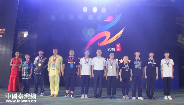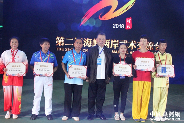 中國(guó)臺(tái)灣網(wǎng)8月20日石家莊訊 (記者 王莉婷)8月19日上午,“第二界海峽兩岸武術(shù)交流會(huì)”之“共揚(yáng)武威”(競(jìng)賽)環(huán)節(jié)在河北石家莊舉行了頒獎(jiǎng)儀式,河北省臺(tái)辦主任王立杰、省臺(tái)辦副主任付輝東、臺(tái)灣中華全球洪門聯(lián)盟總會(huì)長(zhǎng)劉會(huì)進(jìn)等領(lǐng)導(dǎo)和嘉賓出席并頒獎(jiǎng)。