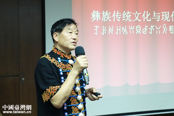 中國(guó)民間文藝家協(xié)會(huì)副主席沙馬拉毅向臺(tái)灣青年及基層民眾講彝族文化。(圖片為主辦方供圖)