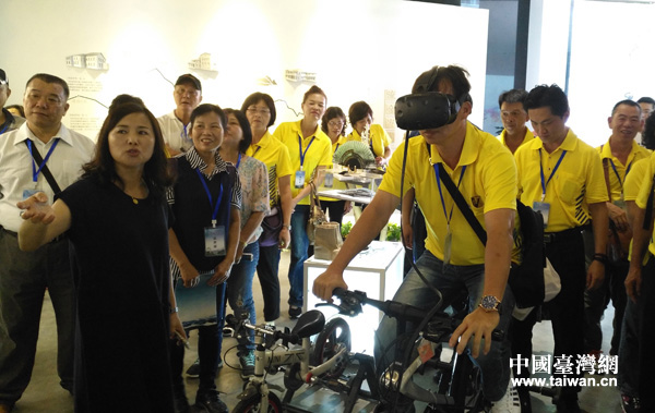 臺(tái)灣同胞在莫干山海峽兩岸交流展示館里騎車體驗(yàn)VR科技。(中國(guó)臺(tái)灣網(wǎng) 王文英 攝)
