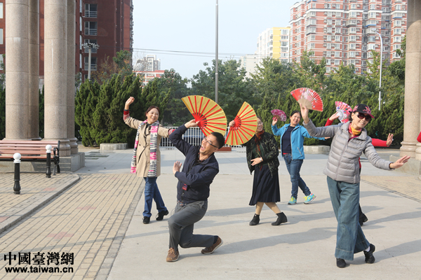 兩岸記者與陽(yáng)春新紀(jì)元里的大媽一起跳廣場(chǎng)舞《中國(guó)范兒》。(中國(guó)臺(tái)灣網(wǎng) 陳佳慧 攝)