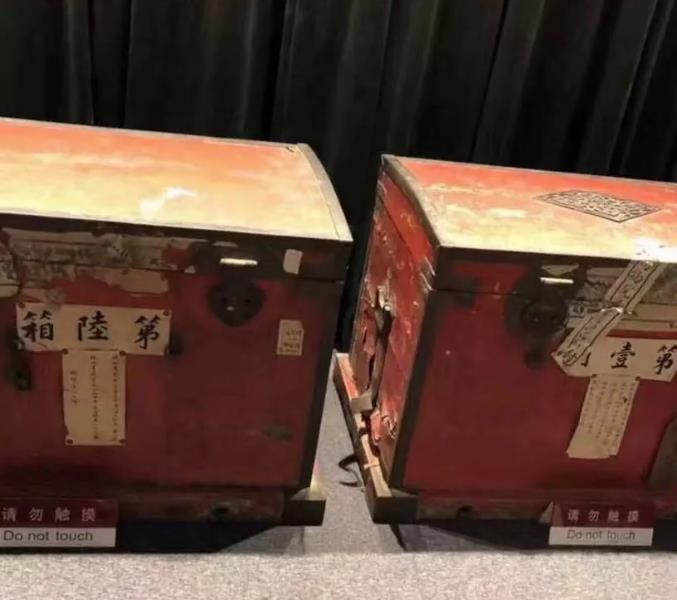 裝載故宮文物的紅漆木箱子。(圖片來源:“海研智庫”微信公眾號)
