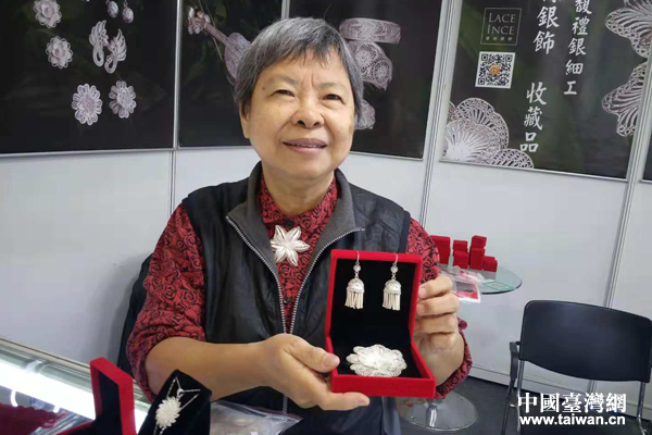 來自新北的劉慈悲向記者展示自己的掐絲銀飾作品。(中國臺(tái)灣網(wǎng) 王怡然 攝)