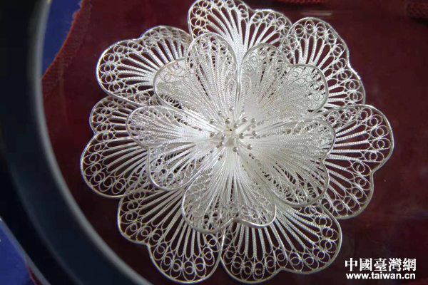 放大鏡下的臺(tái)灣參展商的掐絲銀飾作品。(中國臺(tái)灣網(wǎng) 王怡然 攝)