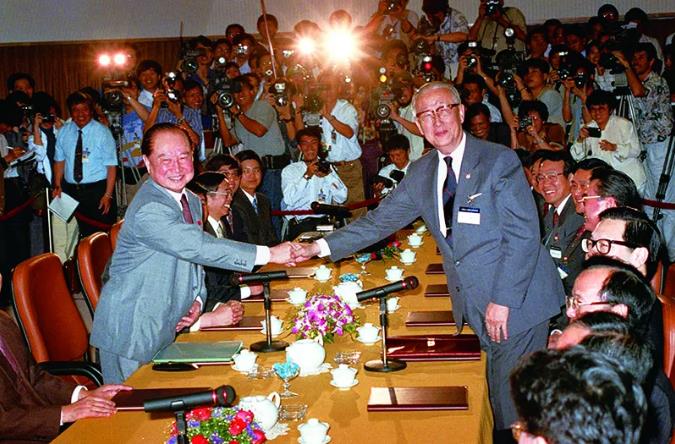 1993年4月27日,首次“汪辜會(huì)談”在新加坡開始,海協(xié)會(huì)和;鶗(huì)代表各10人參加了會(huì)談,這是海峽兩岸授權(quán)民間機(jī)構(gòu)領(lǐng)導(dǎo)人的第一次晤談。會(huì)談前汪道涵(左)與辜振甫握手。 新華社發(fā)