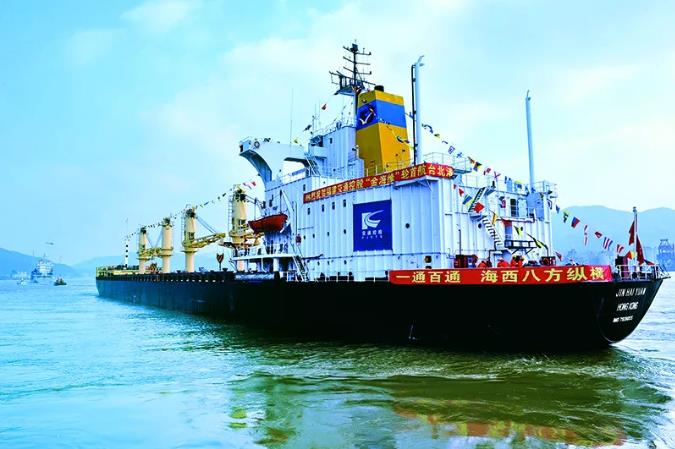 2008年12月15日,海峽兩岸海上直航福州港首航儀式舉行。圖為直航臺(tái)北港的貨輪徐徐離開福州馬尾港。 新華社記者 張國俊/攝