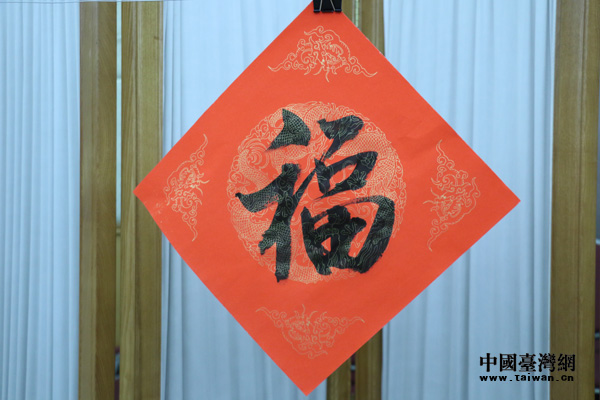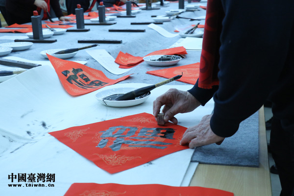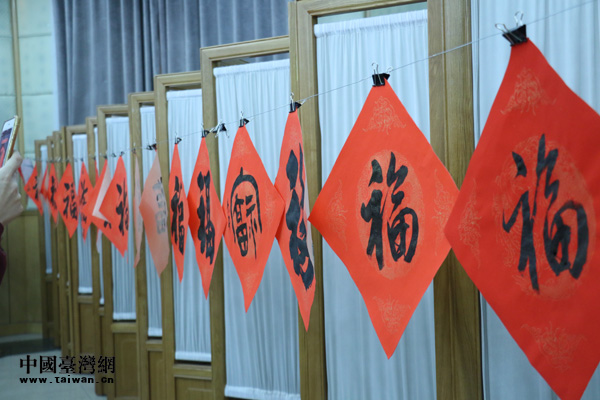 農(nóng)歷豬年將至,活動現(xiàn)場一片祥和之氣,機關員工與書畫家們互動熱絡,互相祝福。書畫家們揮毫舞墨,真草隸篆,風格各異的“福”字躍然紙上。“共筑百年中國夢,點贊兩岸一家親!币桓备备桧瀮砂逗兔篮蒙畹膶β(lián),蘊含著海峽兩岸同胞祈盼祖國統(tǒng)一的美好愿望和新年美好祝福。