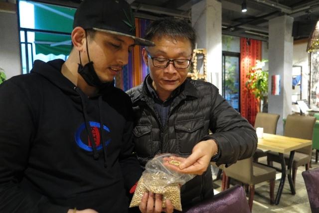 圖為周世豪(左一)與客商討論產(chǎn)品。(受訪者供圖)