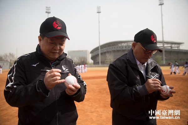 國(guó)臺(tái)辦副主任龍明彪、海峽兩岸棒球交流合作委員會(huì)名譽(yù)主席彭誠(chéng)浩在棒球上簽名(中國(guó)臺(tái)灣網(wǎng)發(fā) 主辦方供圖)