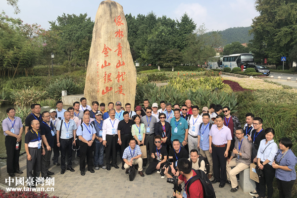 在刻有習近平總書記“兩山”理論的石雕下合影留念。(中國臺灣網(wǎng) 李航 攝)