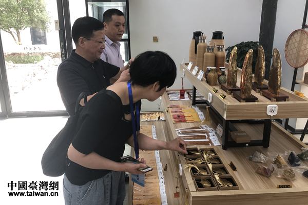 欣賞余村文創(chuàng)產(chǎn)品。(中國臺灣網(wǎng) 李航 攝)