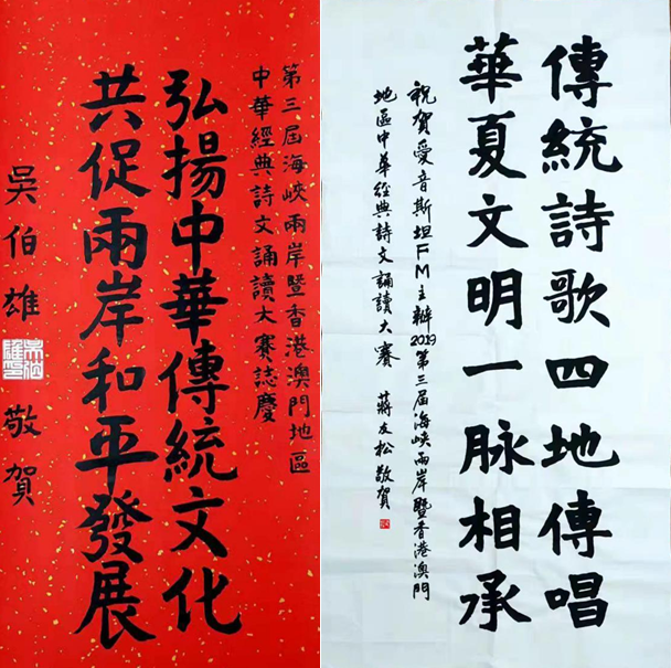 前中國國民黨主席吳伯雄與海峽兩岸和諧文化交流協(xié)進(jìn)會名譽(yù)會長蔣友松為大賽題詞。(圖片來源:主辦方供圖)