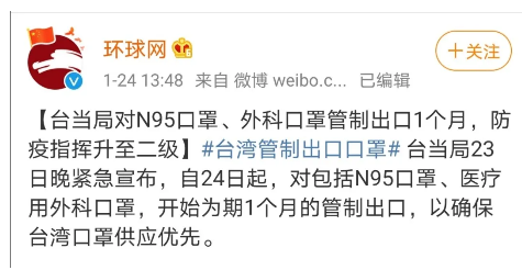 其二,就在今年1月底新冠肺炎疫情爆發(fā)之時,臺當局公告自1月24日起至2月23日止,為期1個月的期間,“紡織材料制口罩,過濾效果94%及以上者”(即N95口罩)及“其他紡織材料制口罩”管制出口。之后,在此前為期1個月的“口罩出口禁令”還未結束時,臺“經(jīng)濟部”就已于2月13日宣布將禁令再度延長至4月底。