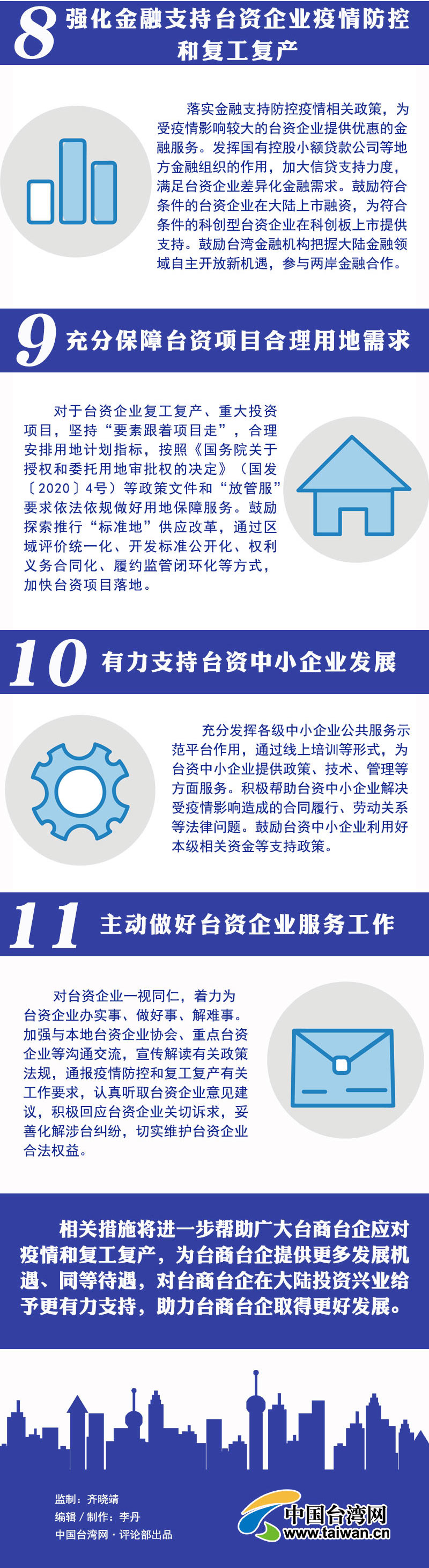15日,國家發(fā)展改革委、國務(wù)院臺(tái)辦、工業(yè)和信息化部等十部門聯(lián)合印發(fā)了助力臺(tái)企“11條措施”。相關(guān)措施將進(jìn)一步幫助廣大臺(tái)商臺(tái)企應(yīng)對(duì)疫情和復(fù)工復(fù)產(chǎn),為臺(tái)商臺(tái)企提供更多發(fā)展機(jī)遇、同等待遇,對(duì)臺(tái)商臺(tái)企在大陸投資興業(yè)給予更有力支持。