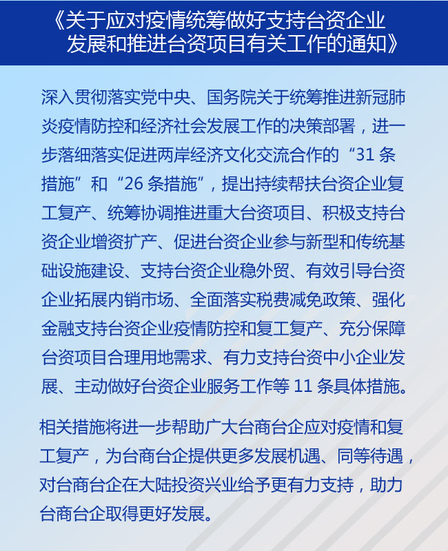 附件:關(guān)于應(yīng)對(duì)疫情統(tǒng)籌做好支持臺(tái)資企業(yè)發(fā)展和推進(jìn)臺(tái)資項(xiàng)目有關(guān)工作的通知(全文)