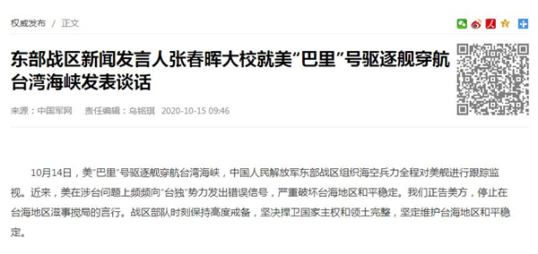 東部戰(zhàn)區(qū)新聞發(fā)言人張春暉大校就美“巴里”號驅(qū)逐艦穿航臺灣海峽發(fā)表談話。