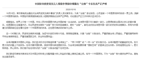中國駐印度大使館16日就印媒播出“臺獨”專訪發(fā)表嚴(yán)正聲明!