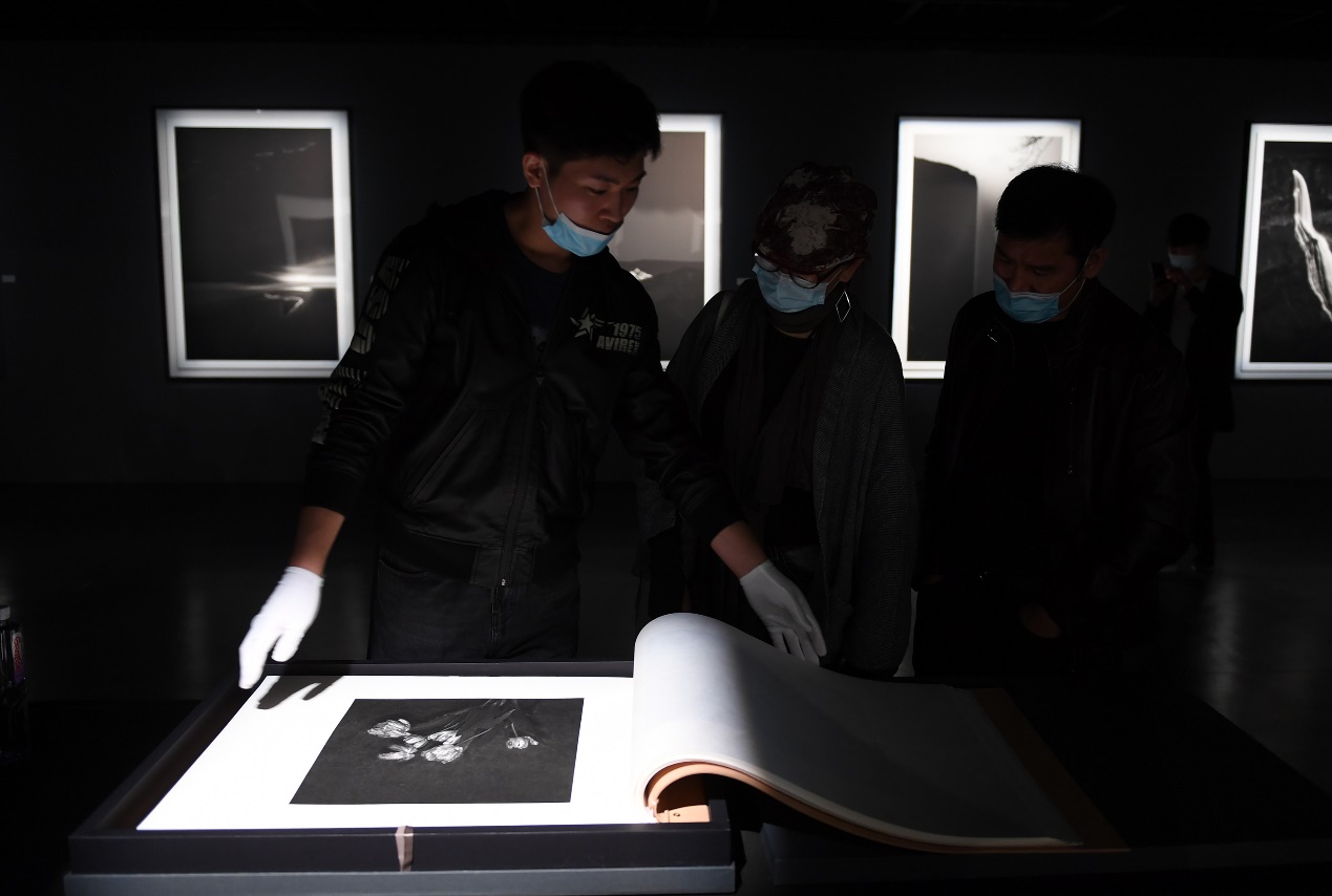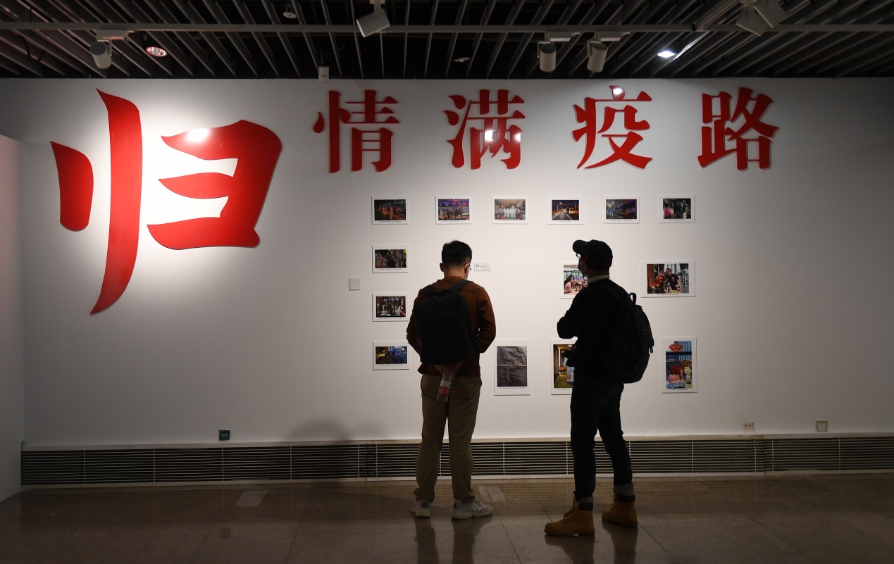 參觀者在“疫”路同行專題攝影展區(qū)觀展