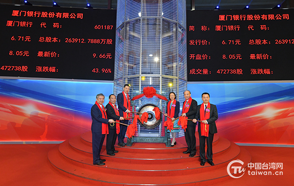 大陸首家具有臺資背景的城市商業(yè)銀行——廈門銀行27日正式在上交所敲鐘上市。(中國臺灣網(wǎng)發(fā))