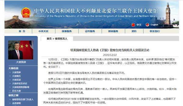 中國駐英使館致函《衛(wèi)報》批駁臺灣當(dāng)局有關(guān)人員錯誤言論