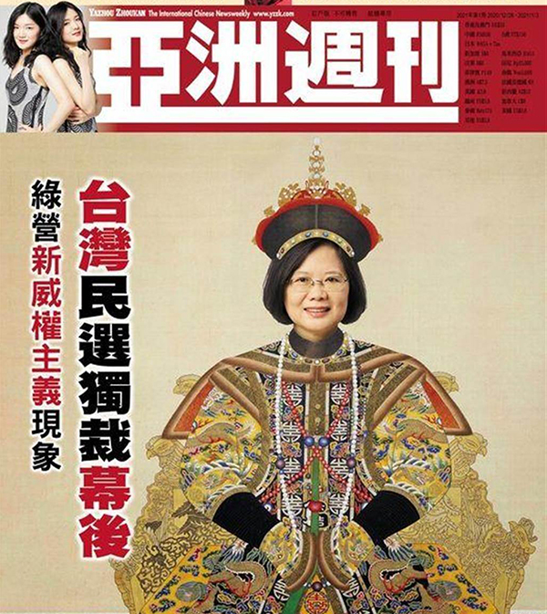 中國臺灣網(wǎng)12月28日訊 (記者 吳怡 李柏濤)最新一期香港《亞洲周刊》以蔡英文穿龍袍的諷刺漫畫為封面,專題報道臺灣“民選獨裁”的真相,并引述了張俊宏、林正杰、陳水扁、呂秀蓮等民進黨創(chuàng)黨元老的看法,反映臺灣主流民意,顯示各方對臺灣民選領(lǐng)袖“走向獨裁”的憂慮。多位兩岸學(xué)者認(rèn)為,“民選獨裁”是對蔡英文最貼切的評語,也是民進黨及蔡英文甩不了的烙印,也佐證了所謂“臺式民主”在臺灣幾十年實踐的失敗,臺灣民眾要思考下次選舉時,是否還要投票給民進黨。