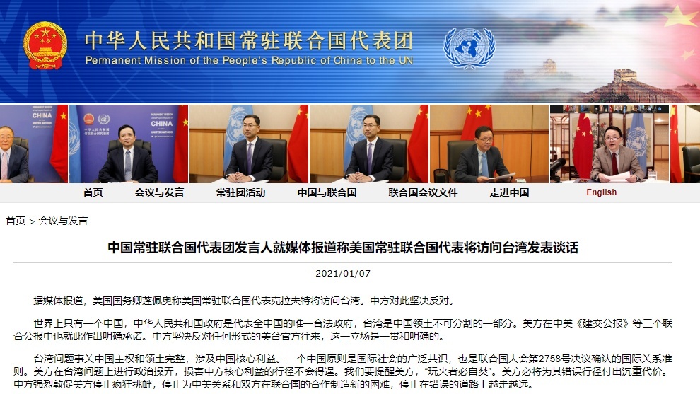 中國聯(lián)代團發(fā)言人:堅決反對美常駐聯(lián)合國代表訪臺。(圖片截自官網(wǎng))