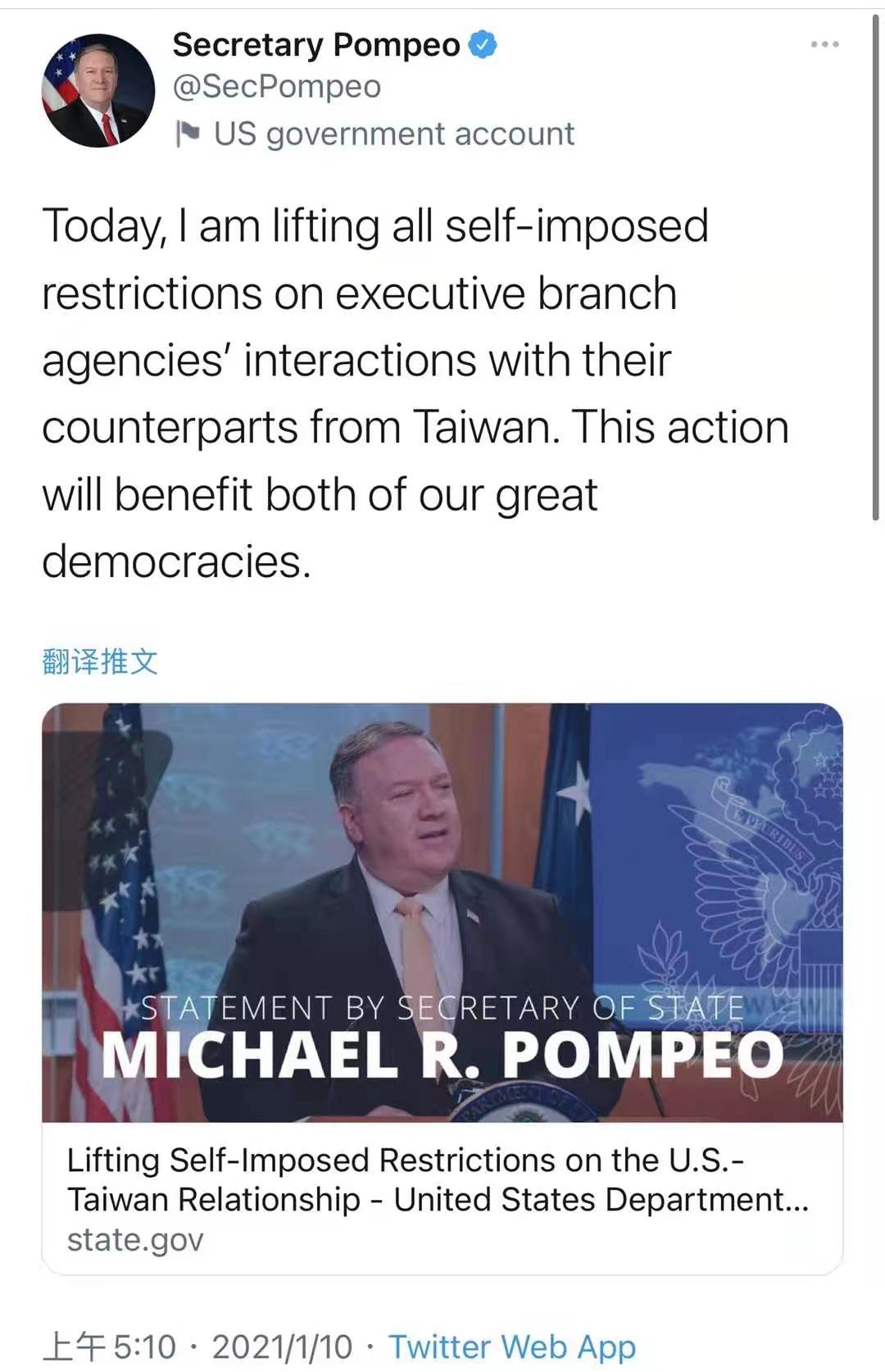 中國(guó)臺(tái)灣網(wǎng)1月10日訊 特朗普政府距離卸任不足兩周,在涉臺(tái)問題上連續(xù)拋出“瘋狂之舉”。據(jù)環(huán)球網(wǎng)引述法新社報(bào)道,美國(guó)務(wù)卿蓬佩奧9日在社交媒體發(fā)文,宣稱“美方將停止美國(guó)官方在與臺(tái)灣接觸上的限制”。臺(tái)媒也報(bào)道稱,美國(guó)國(guó)務(wù)院宣布取消美臺(tái)交往限制,是特朗普對(duì)臺(tái)灣的“卸任大禮”。