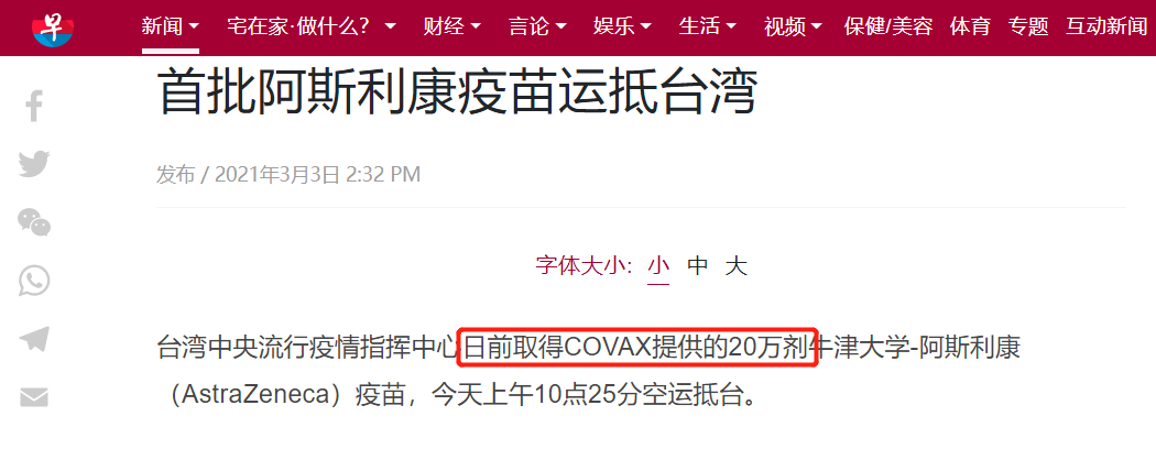 除了疫苗來源外,該消息的另一個(gè)爭議點(diǎn)則是首批抵臺(tái)疫苗的總數(shù)。新加坡《聯(lián)合早報(bào)》的報(bào)道中沿用了疫苗來自COVAX平臺(tái)的說法,并表示這批疫苗的總劑量是20萬劑,而不是臺(tái)灣“中央社”和RFI所寫的11.7萬劑。