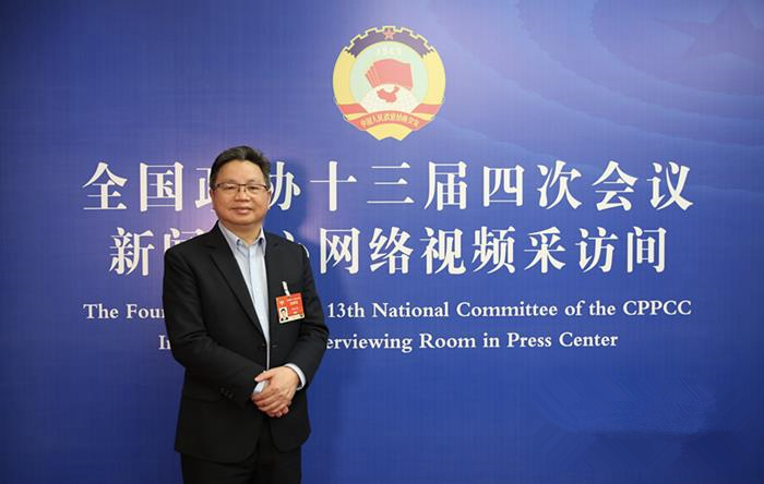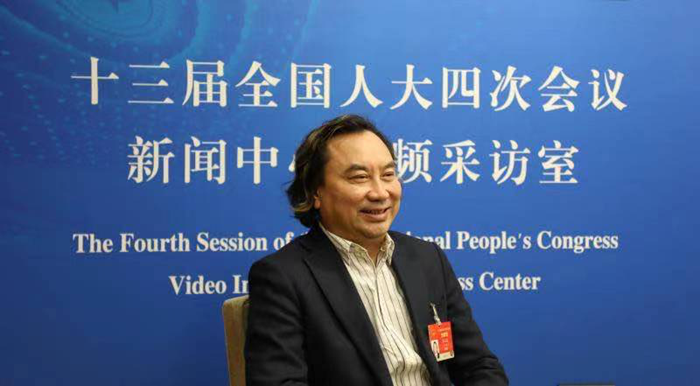 圖為全國(guó)臺(tái)聯(lián)副會(huì)長(zhǎng)楊毅周委員。全國(guó)政協(xié)十三屆四次會(huì)議新聞中心網(wǎng)絡(luò)視頻采訪間供圖