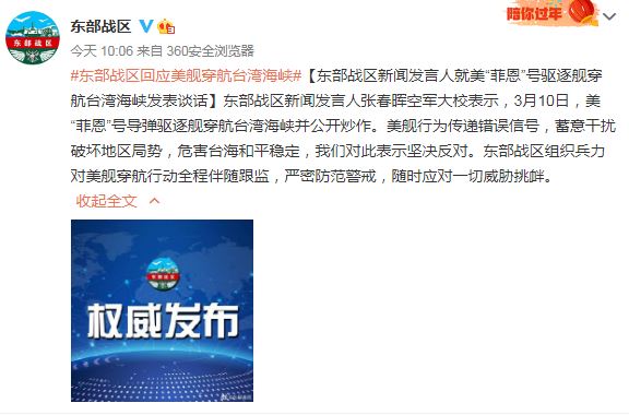 東部戰(zhàn)區(qū)新聞發(fā)言人就美“菲恩”號(hào)驅(qū)逐艦穿航臺(tái)灣海峽發(fā)表談話。