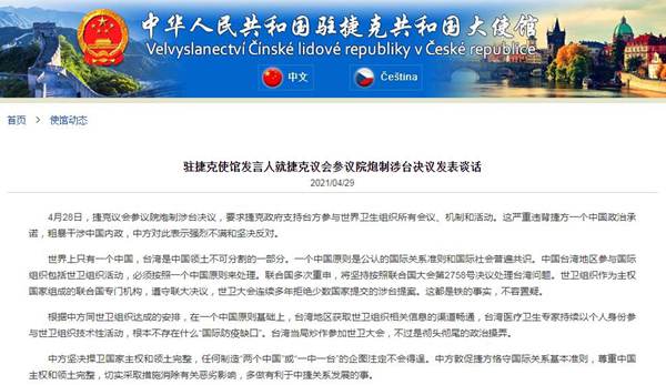 駐捷克使館發(fā)言人29日就捷克議會參議院炮制涉臺決議發(fā)表談話。