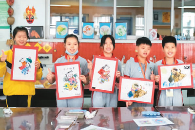 圖為兩岸學(xué)生展示親手創(chuàng)作的年畫(huà)。