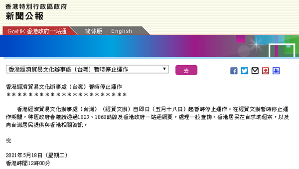 港府公報:香港經(jīng)濟貿易文化辦事處(臺灣)暫時停止運作