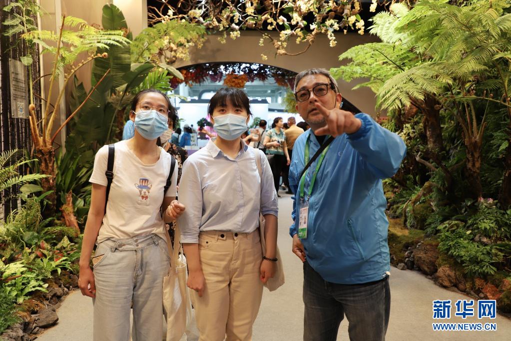 來自上海奉賢區(qū)的沈女士(中)成為室內(nèi)臺(tái)灣館第30萬名觀眾,臺(tái)灣館館長(zhǎng)林惠義(右)親自為她導(dǎo)覽(6月18日攝)。