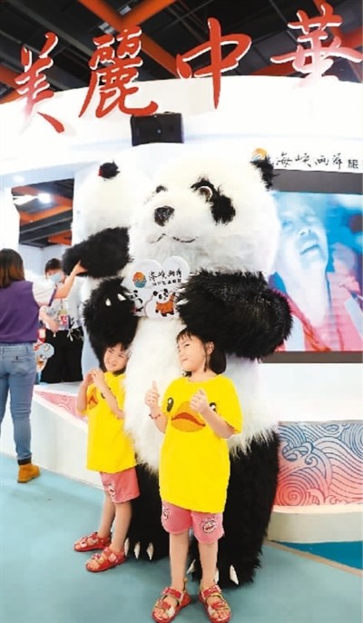 圖為二〇二〇臺北夏季旅展兩岸展區(qū),小朋友和熊貓人偶合影。