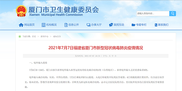 中國臺灣網(wǎng)7月7日訊 廈門市衛(wèi)生健康委員會7日通報, 7月6日0—24時,廈門市報告新增境外輸入新型冠狀病毒肺炎確診病例1例(臺灣地區(qū)),新增境外輸入無癥狀感染者0例