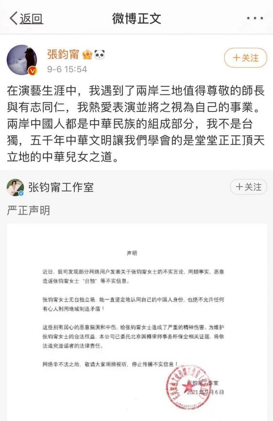 隨后,張鈞甯也轉發(fā)工作室微博再次重申:“在演藝生涯中,我遇到了兩岸三地值得尊敬的師長與有志同仁,我熱愛表演并將之視為自己的事業(yè)。兩岸中國人都是中華民族的組成部分,我不是‘臺獨’,五千年中華文明讓我們學會的是堂堂正正頂天立地的中華兒女之道!保ㄍ辏