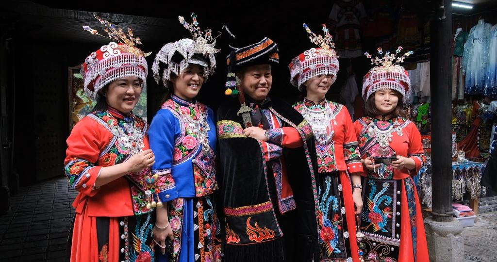 11月3日,臺灣媒體記者在恩施土司城體驗土家族服飾。新華社記者 賈金明 攝
