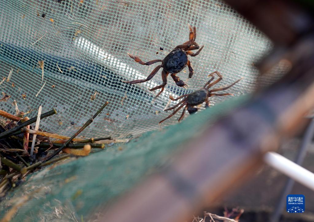 上海海洋大學(xué)吳旭干教授在查看種蟹狀況(11月25日攝)。新華社記者 劉穎 攝