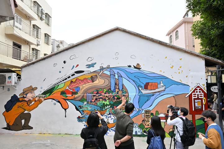 在百年街區(qū)集美大社,幢幢閩南紅磚厝古韻猶在。一周來,在這些老墻上,兩岸藝術(shù)家創(chuàng)作出多幅構(gòu)思巧妙的涂鴉作品。其中一幅名為《海峽一日游》,展現(xiàn)了廈門港、“雙子塔”以及莒光樓等廈門、金門兩地景點,浮雕刻畫,栩栩如生。